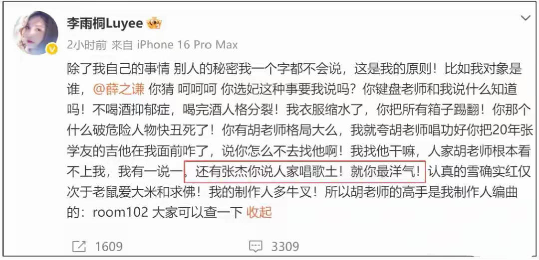 事情的起因,还是薛之谦“感情”问题。李雨桐十年后翻旧账,不仅提到了胡彦斌、还提到了张学友、张杰……