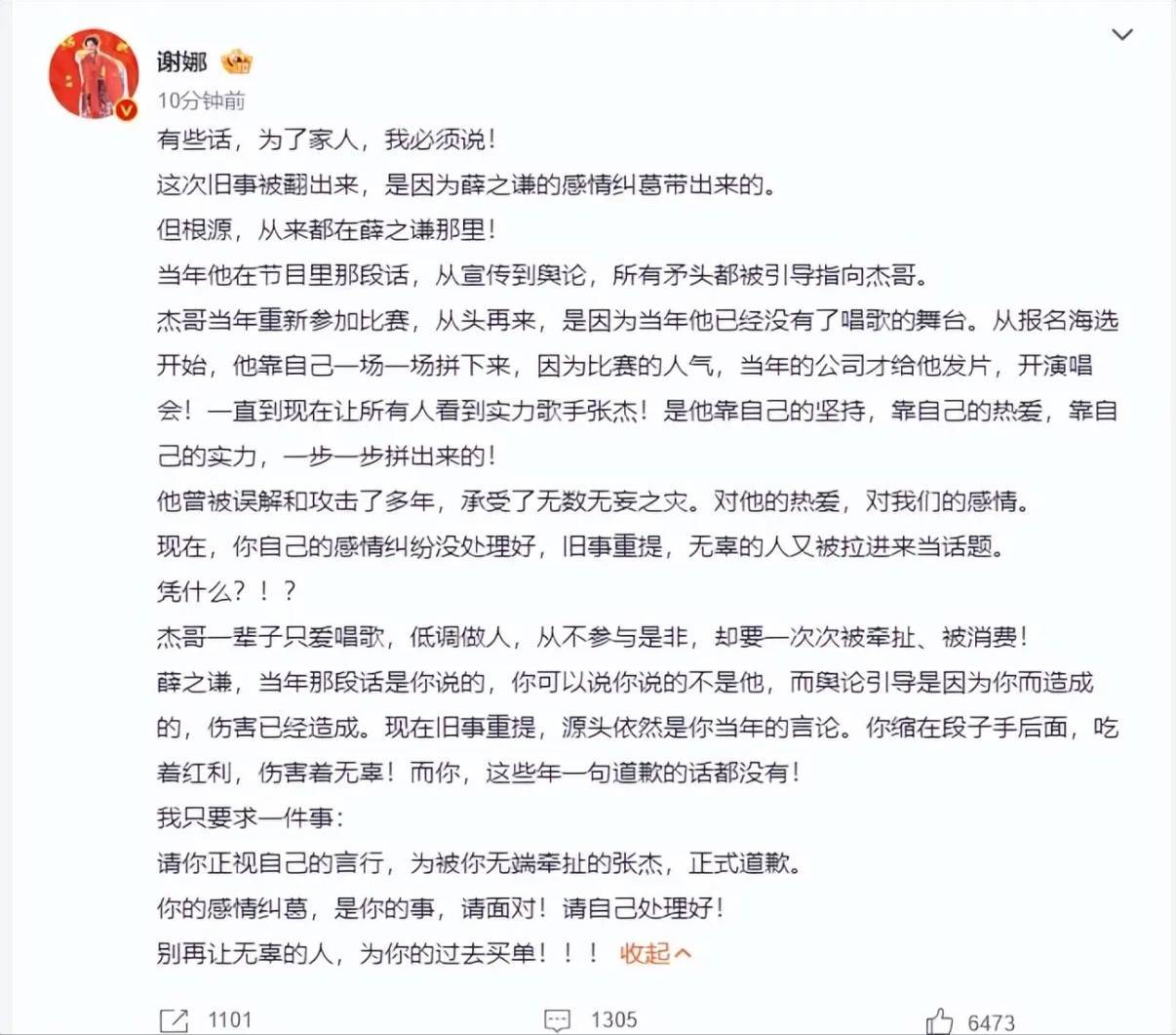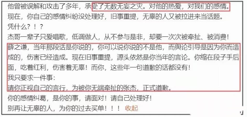 张杰一辈子只爱唱歌、低调做人。薛之谦,当年亲口说了那段话。他可以说不是说的张杰,但舆论导向伤害的就是张杰。